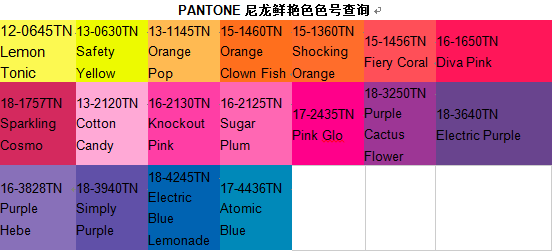 · 新的尼龙色卡系列包含21种重要的鲜艳萤光色彩,让设计师在开发尼龙物料的产品时,能精确地以全球认可的色彩标准选择指定及复制色彩
